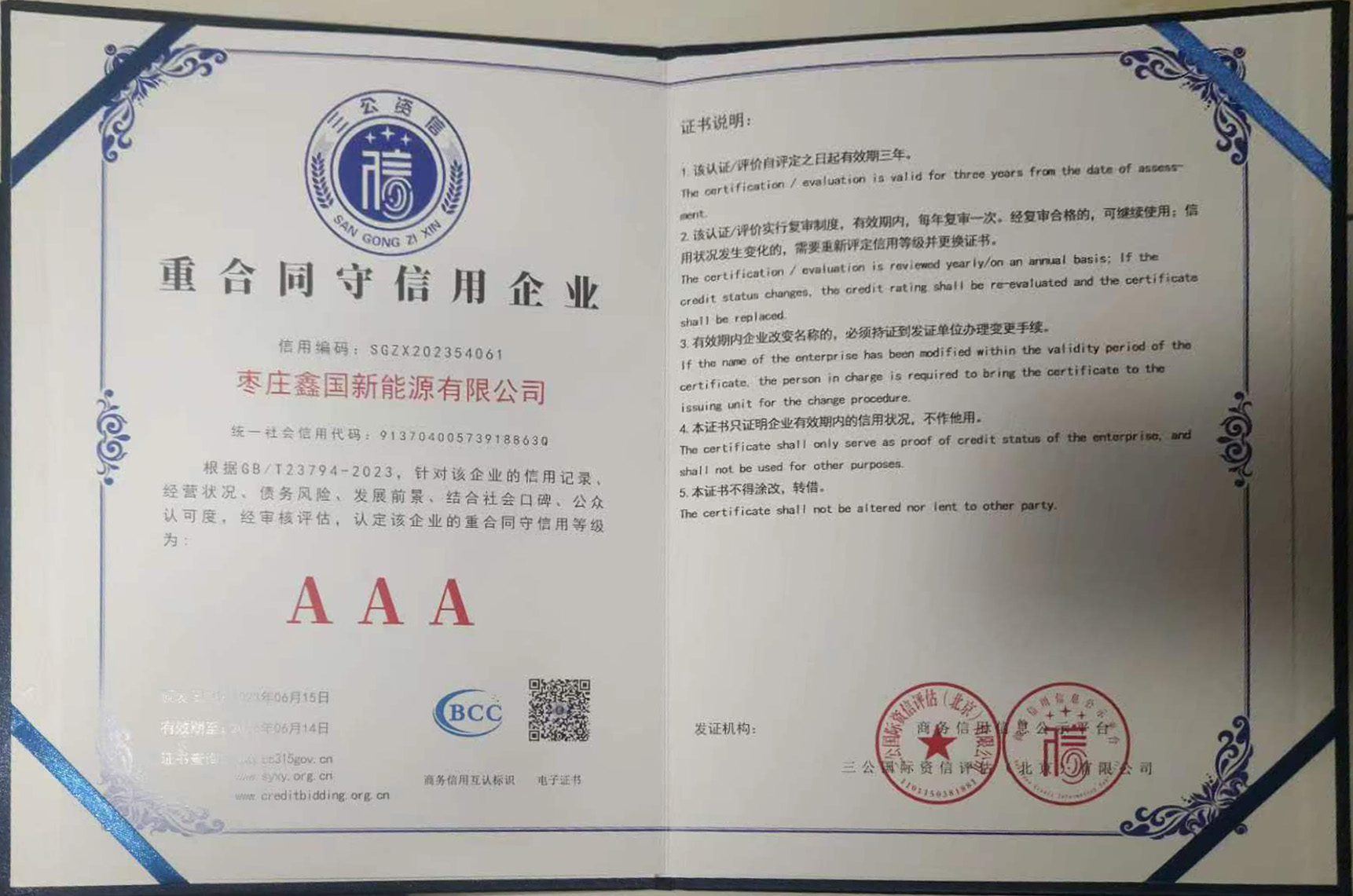 枣庄鑫国新能源有限公司成立于2011年4月27日,是一家专注于高性能材料研发与生产的高新技术企业。公司自成立以来,始终秉持着“品质为本,服务至上”的发展理念,致力于为客户提供品质产品和完善的服务。【枣庄鑫国新能源有限公司】